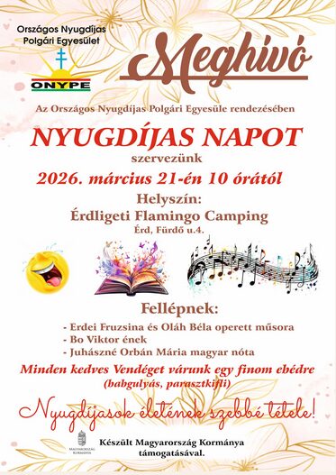 Az Országos Nyugdíjas Polgári Egyesület szeretettel várja Érd és a környező települések nyugdíjasait egy vidám, közösségi programra, a Nyugdíjas Napra, amelyet 2026. március 21-én, szombaton 10 órától rendeznek meg az Érdligeti Flamingo Campingben (Érd, Fürdő utca 4.).